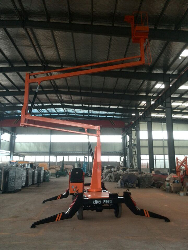 自行曲(折)臂式升降機(jī)升高時候是曲折狀態(tài)的,升降平臺的結(jié)構(gòu)采用了機(jī)電液一體化、可靠性設(shè)計(jì)和計(jì)算機(jī)輔助設(shè)計(jì)等技術(shù),是一種全液壓驅(qū)動、自行式專用底盤。突破了以往國內(nèi)高空作業(yè)升降機(jī)只能采用汽車或起重機(jī)底盤改裝設(shè)計(jì)的限制。自行曲(折0臂升降機(jī),曲臂式往往體積較小,帶載行駛、作業(yè)穩(wěn)定性好。底盤結(jié)構(gòu)突破了傳統(tǒng)的設(shè)計(jì)理論和方法,通過優(yōu)化上車平臺總體布局與載荷分布,減少了重心偏移。采用獨(dú)特的大角度后仰式鉸點(diǎn)結(jié)構(gòu),合理設(shè)置多種配重模塊,有效地平衡了工作力矩。采用H型變截面復(fù)合箱梁剮性車架和高負(fù)荷橡膠輪胎,增加了底盤整體剛度,保證了整機(jī)行駛、作業(yè)過程的穩(wěn)定性實(shí)現(xiàn)了高空作業(yè)升降機(jī)帶載行駛的功能。通過大臂前端托架可以快速安裝舉升裝置或載人平臺,實(shí)現(xiàn)物料舉升、起重吊裝和載人高空作業(yè)等功能同時為擴(kuò)展作業(yè)裝置以及各種工作裝置的快速切換提供了接口。設(shè)計(jì)的三維旋轉(zhuǎn)托舉裝置,既能夠自動保持被舉升物料的姿態(tài),又可以實(shí)現(xiàn)舉升物料在空間內(nèi)任意高度、任意位置和任意方向的調(diào)整要求,速度控制精確靈敏,微動性能好,滿足了大型洞庫內(nèi)高空作業(yè)與通風(fēng)管道安裝的要求。