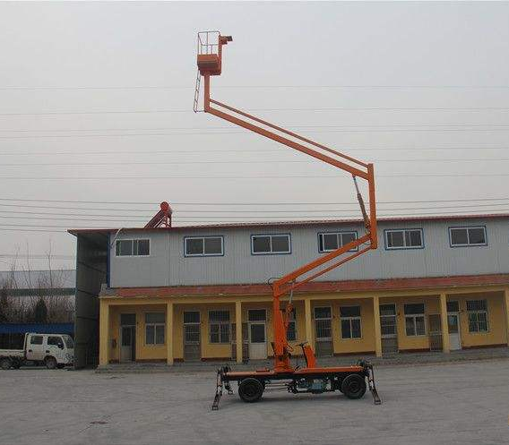 自行曲(折)臂式升降機升高時候是曲折狀態的,升降平臺的結構采用了機電液一體化、可靠性設計和計算機輔助設計等技術,是一種全液壓驅動、自行式專用底盤。突破了以往國內高空作業升降機只能采用汽車或起重機底盤改裝設計的限制。自行曲(折0臂升降機,曲臂式往往體積較小,帶載行駛、作業穩定性好。底盤結構突破了傳統的設計理論和方法,通過優化上車平臺總體布局與載荷分布,減少了重心偏移。采用獨特的大角度后仰式鉸點結構,合理設置多種配重模塊,有效地平衡了工作力矩。采用H型變截面復合箱梁剮性車架和高負荷橡膠輪胎,增加了底盤整體剛度,保證了整機行駛、作業過程的穩定性實現了高空作業升降機帶載行駛的功能。通過大臂前端托架可以快速安裝舉升裝置或載人平臺,實現物料舉升、起重吊裝和載人高空作業等功能同時為擴展作業裝置以及各種工作裝置的快速切換提供了接口。設計的三維旋轉托舉裝置,既能夠自動保持被舉升物料的姿態,又可以實現舉升物料在空間內任意高度、任意位置和任意方向的調整要求,速度控制精確靈敏,微動性能好,滿足了大型洞庫內高空作業與通風管道安裝的要求。