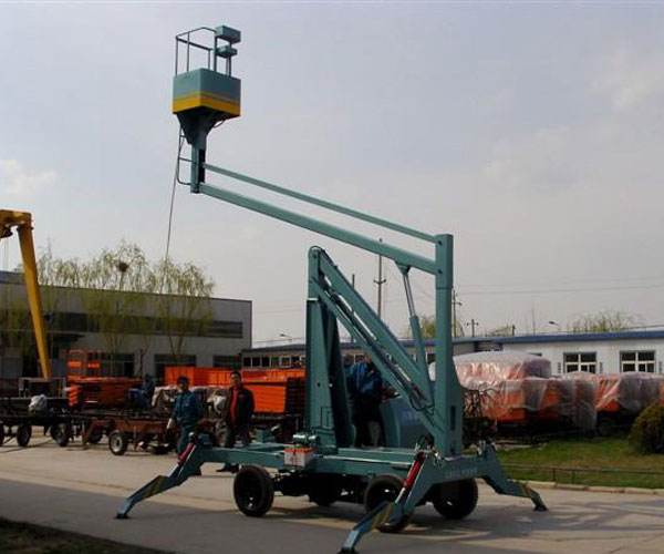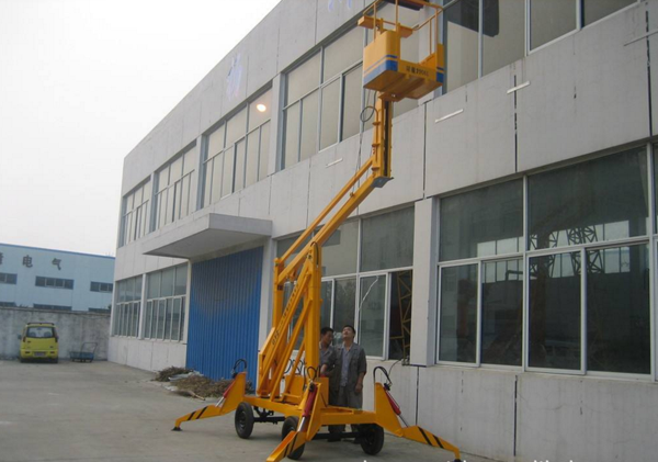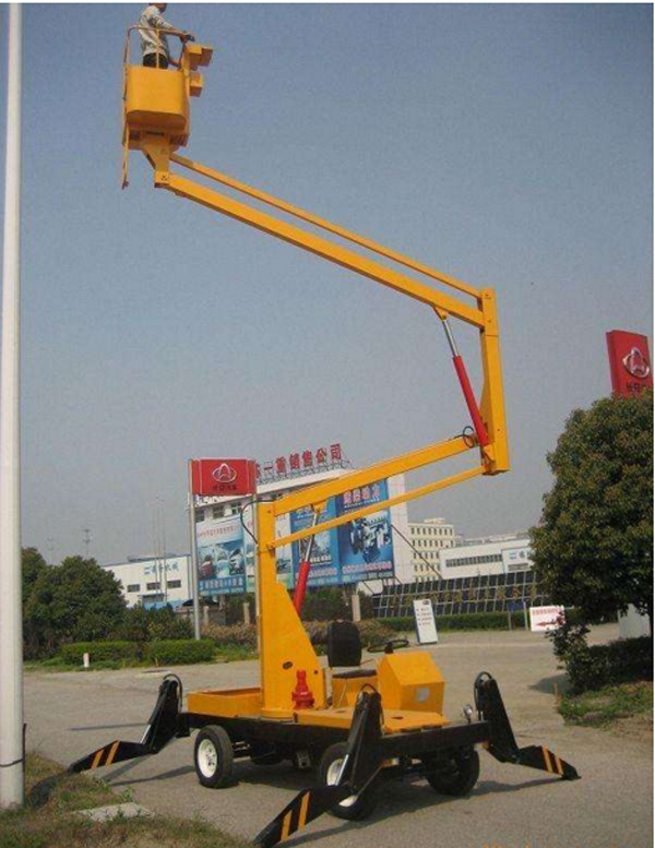 自行曲(折)臂式升降機升高時候是曲折狀態(tài)的,升降平臺的結構采用了機電液一體化、可靠性設計和計算機輔助設計等技術,是一種全液壓驅動、自行式專用底盤。突破了以往國內(nèi)高空作業(yè)升降機只能采用汽車或起重機底盤改裝設計的限制。自行曲(折0臂升降機,曲臂式往往體積較小,帶載行駛、作業(yè)穩(wěn)定性好。底盤結構突破了傳統(tǒng)的設計理論和方法,通過優(yōu)化上車平臺總體布局與載荷分布,減少了重心偏移。采用獨特的大角度后仰式鉸點結構,合理設置多種配重模塊,有效地平衡了工作力矩。采用H型變截面復合箱梁剮性車架和高負荷橡膠輪胎,增加了底盤整體剛度,保證了整機行駛、作業(yè)過程的穩(wěn)定性實現(xiàn)了高空作業(yè)升降機帶載行駛的功能。通過大臂前端托架可以快速安裝舉升裝置或載人平臺,實現(xiàn)物料舉升、起重吊裝和載人高空作業(yè)等功能同時為擴展作業(yè)裝置以及各種工作裝置的快速切換提供了接口。設計的三維旋轉托舉裝置,既能夠自動保持被舉升物料的姿態(tài),又可以實現(xiàn)舉升物料在空間內(nèi)任意高度、任意位置和任意方向的調(diào)整要求,速度控制精確靈敏,微動性能好,滿足了大型洞庫內(nèi)高空作業(yè)與通風管道安裝的要求。