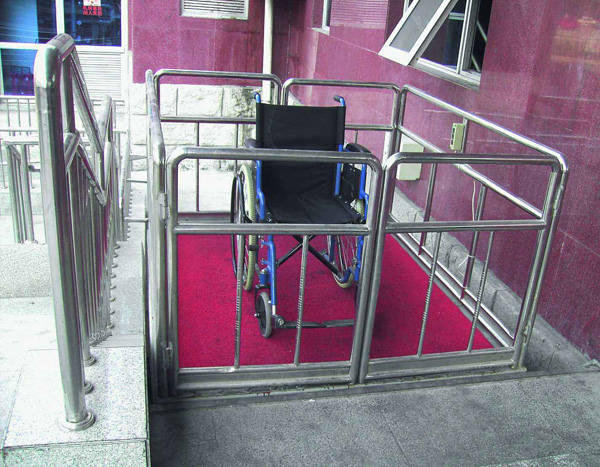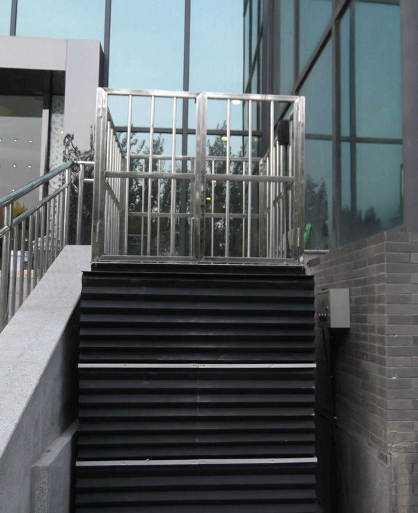 無障礙殘疾人升降機(jī),主要是由導(dǎo)軌和升降平臺(tái)板組成的,類似一個(gè)簡(jiǎn)易的小電梯。導(dǎo)軌是鑲嵌在通道出入口的墻壁上的,隨著樓梯的坡度向下延伸,一直到地道內(nèi)部。而升降平臺(tái)在不使用時(shí)可以折疊靠著墻壁放置,這樣不會(huì)占用通道出入口處的空間。乘坐輪椅的殘疾人在使用時(shí),輪椅四個(gè)輪子可以被固定在臺(tái)板上,按動(dòng)開關(guān)后就可以控制升降平臺(tái)進(jìn)入地下通道,安全方便。